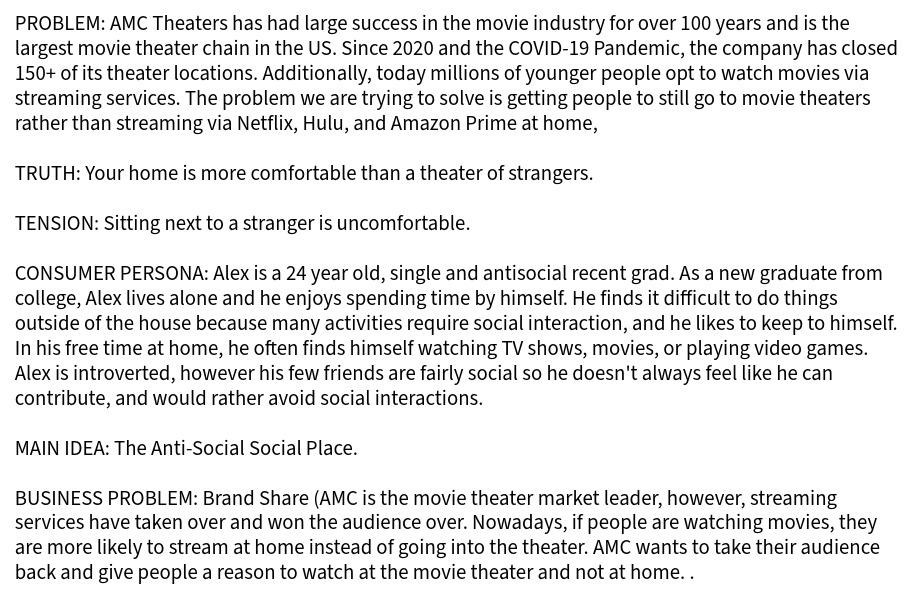Presentation for a mock AMC Theaters campaign focused on "the antisocial social place."